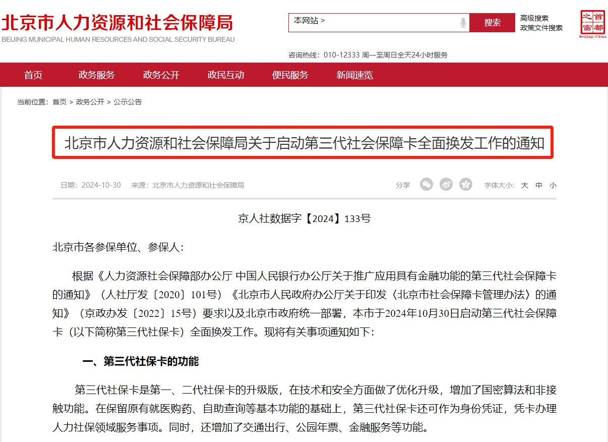 10月30日,北京市人力资源和社会保障局发布了关于启动第三代社会保障卡(以下简称第三代社保卡)全面换发工作的通知,即日起将分阶段、分人群、分批次进行第三代社保卡集中换发。