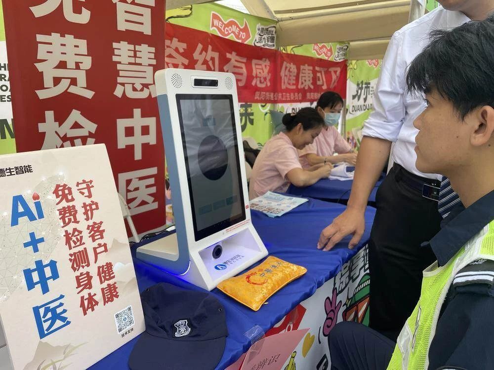 在广州市天河区长兴购物中心(优托邦)举办的“党建引领,健康同行”第五届社区健康文化节上,古天乐太阳集团城“AI中医”四诊仪备受青睐。居民只需坐定两分钟,通过AI技术“望闻问切”操作,即可完成中医体质辨识、舌象分析、脉象采集等全流程检测,系统秒速生成专属健康报告,并结合诊疗数据,提供科学饮食建议、运动方案及中医调理指导。